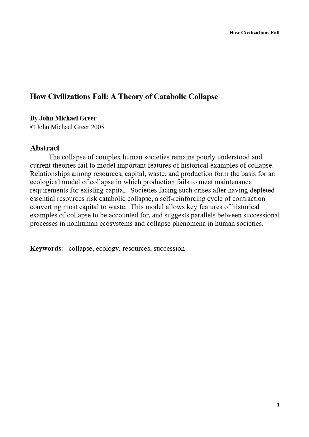 O colapso já está em andamento? John Michael Greer discute o "Colapso Catabólico", um modelo escalonado de declínio que descreve como sociedades em declínio consomem sua própria infraestrutura para se manterem à tona. Em um artigo de 2005, intitulado "Como as Civilizações Caem: Uma Teoria do Colapso Catabólico", ele descreveu um modelo ecológico de colapso no qual a produção falha em atender aos requisitos de manutenção para o capital existente. |